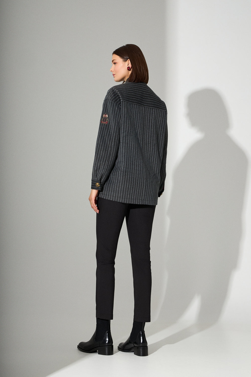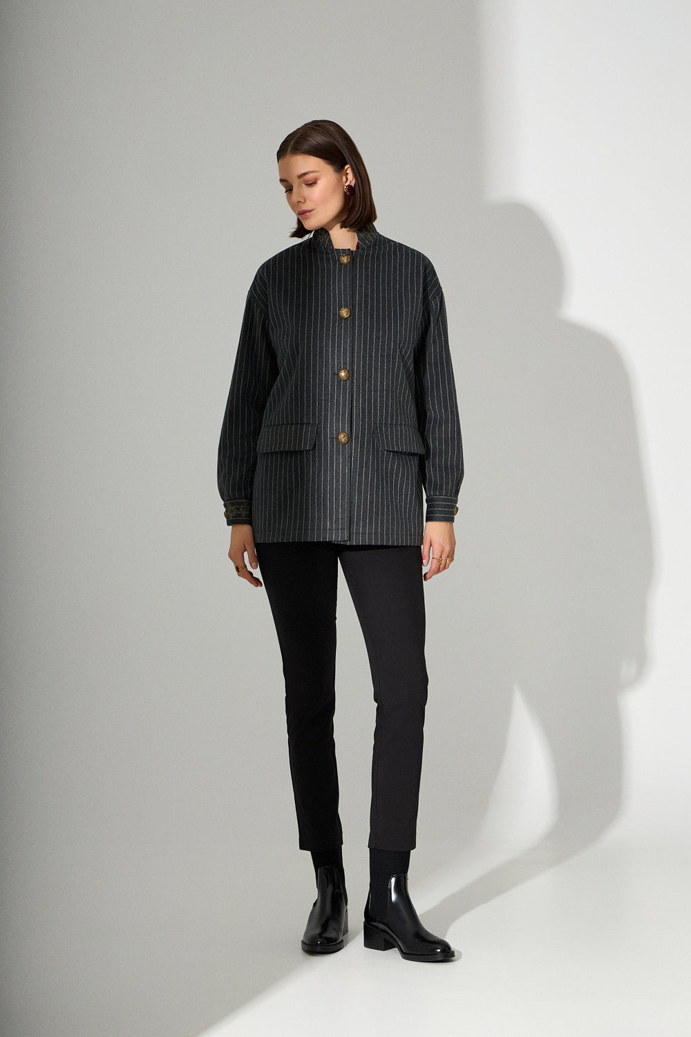 Jacket made of striped wool fabric in a relaxed fit with contrast burgundy lining. Features front patch pockets and dark gold embroidery on the Mao collar, the left cuff, and an emblem on the left sleeve. Front closure with distinctive dark gold metallic heraldic buttons. Perfect for striking appearances — a timeless piece that deserves a place in your wardrobe.