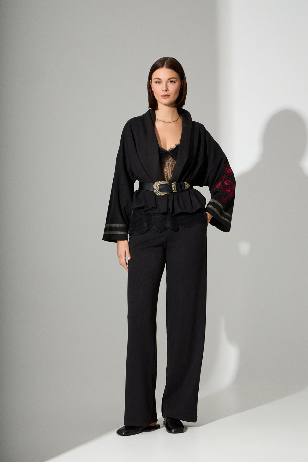 Straight-leg pants with an elastic waistband and black-gold French ribbons on the pockets. Perfect for all-day wear, offering a sense of effortless elegance — pairs ideally with the “Cookie” jacket for a complete, balanced look.