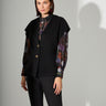 Vest in a relaxed fit · fastens at the front with distinctive metallic buttons · interior finished with burgundy contrast piping · striking back embroidery crafted from black-gold metallic thread. A versatile must-have piece for your wardrobe. Warm and stylish — easily pairs with shirts or tops. Perfect for all-day wear.