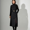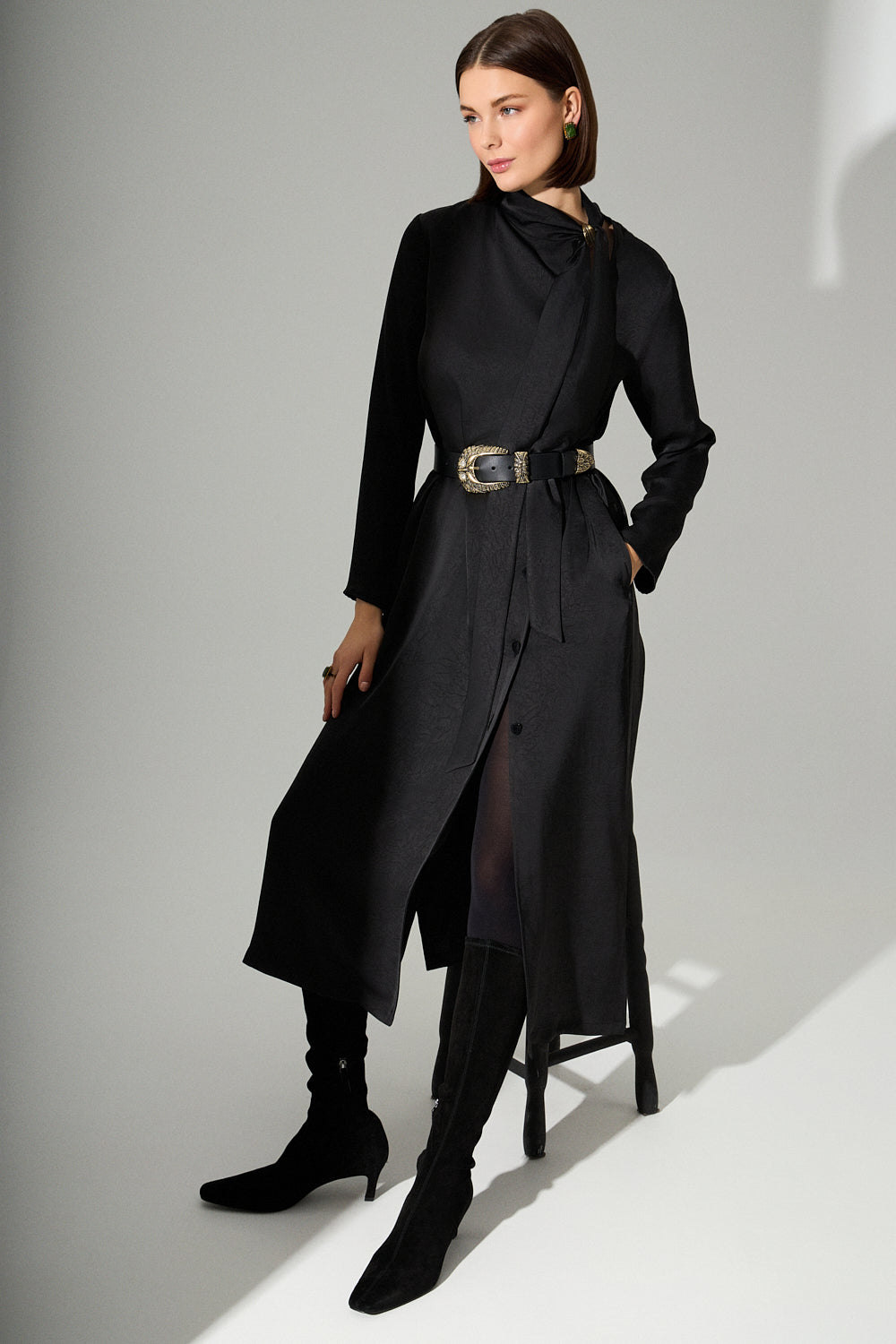 Straight-line dress with a Japanese-inspired aesthetic. The collar extends into a scarf that ties on the left side, featuring a distinctive metallic detail. Front buttons on the left are covered with eco leather. An elegant choice for standout occasions — pairs perfectly with the “Feather” belt.