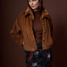 Jacket made of eco fur with eco leather details · features flap pockets on the front and striking buttons along the closure · large collar that fastens up to the top for extra warmth · lined with soft, warm stretch velvet · decorated on the back with unique embroidery crafted from copper metallic thread · ideal for all-day wear as well as standout evening looks.